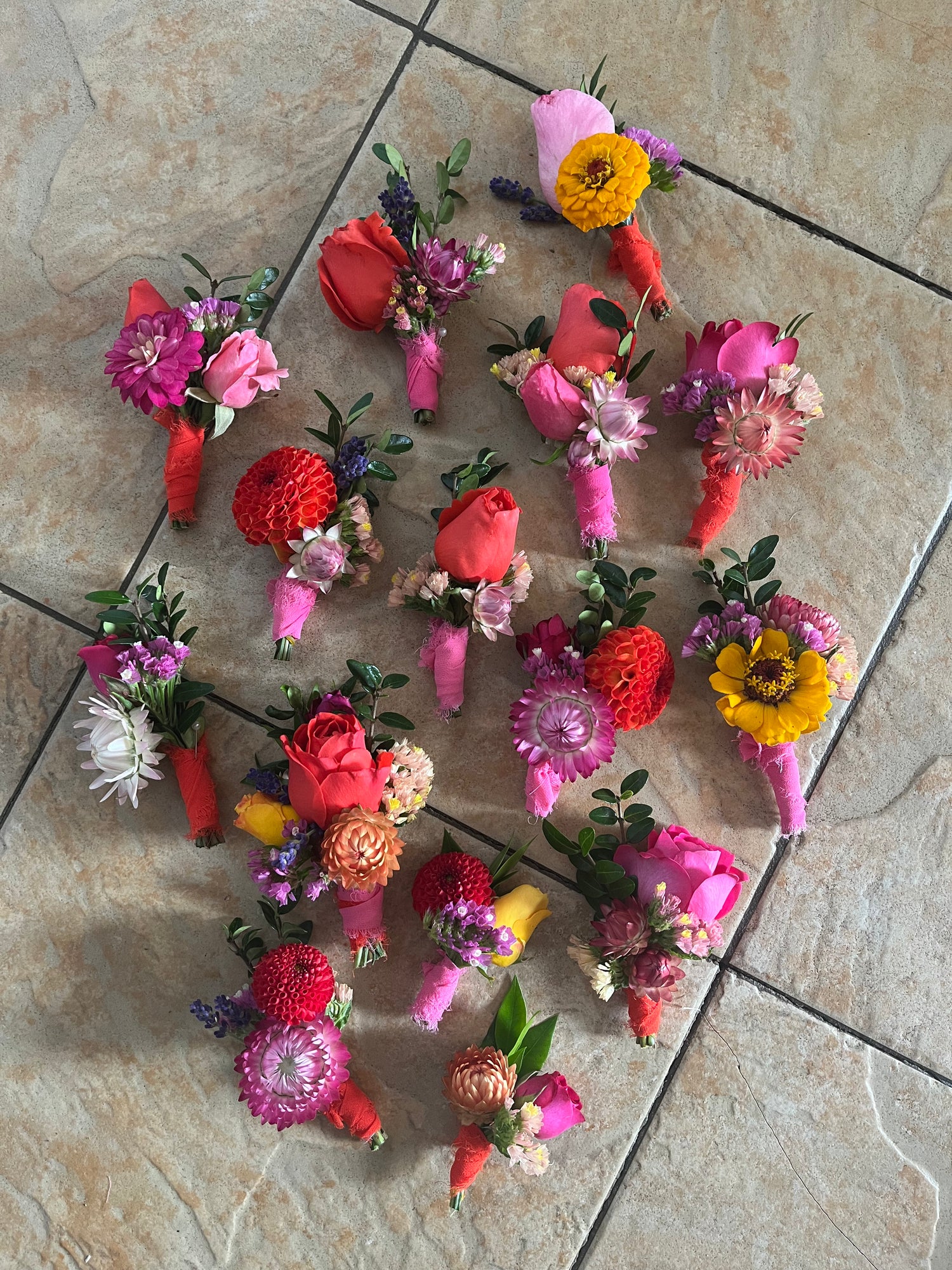 A regular buttonhole will contain one focal flower such as a rose or daliah, one or two accent flowers and some greenery whereas a large will have 2 - 3 focal flowers, 2-3 accents and greenery. You can choose to have your stems wrapped in colourful ribbon or go for natural stem green and they all come with a pin. Often grooms or parents of the bridal party opt for a larger buttonhole.